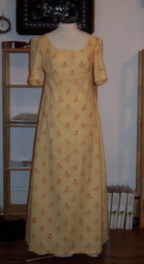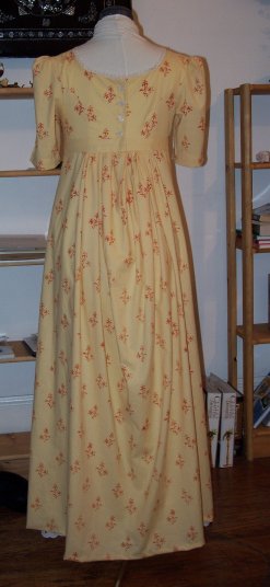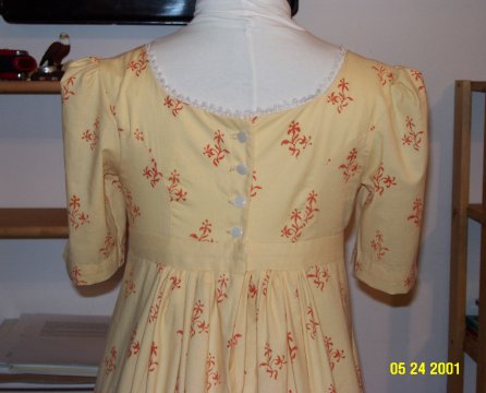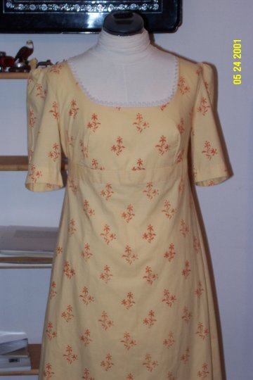 Here is the second dress I made to wear to my father's wedding. I didn't have time to make the bodiced petticoat that I wanted to wear with it, so I just made the little "petticoat" skirt to give the gown skirt some fullness. The large photo is me wearing the dress at my father's wedding. (The shoes ruin the look, but I had no time to find anything more "period"!) I also made a matching reticule from the La Mode Bagatelle pattern, but I wasn't holding it in this photo.